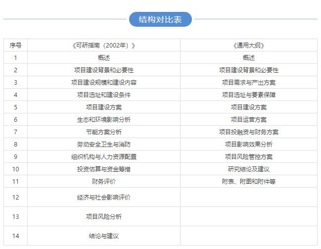 兩版的編寫大綱從目標上來說基本是一致,主要體現(xiàn)為項目建設(shè)的必要性、項目方案的可行性和項目風險可控性。新版《通用大綱)在內(nèi)容主要特點有兩個方面: