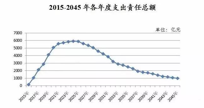 從地區(qū)分布看,中西部地區(qū)支出壓力較大。2015-2045年間,支出責(zé)任總額前五位的分別為湖南8047億元、河南7086億元、四川6906億元、內(nèi)蒙古6241億元和云南5896億元,年均支出分別為260億元、229億元、222億元、201億元和190億元,分別占2017年本省一般公共預(yù)算支出的3.8%、3.1%、2.6%、4.4%和3.3%。